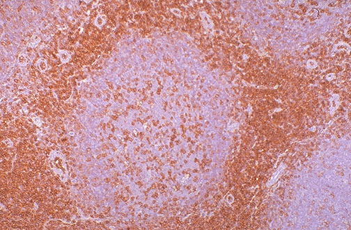 | The nature of the cell population and function of a lymph node is shown here with an immunoperoxidase stain for CD45 RO, a T cell marker. Note the larger number of T cells staining with the red-brown reaction product around the germinal center of a follicle, with additional T cells extending into the paracortex. |