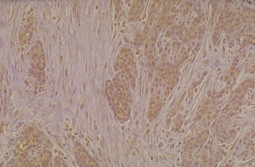This is a parathyroid carcinoma seen at medium power with nests of not very pleomorphic cells that demonstrate positive immunoperoxidase staining with antibody to parathormone.