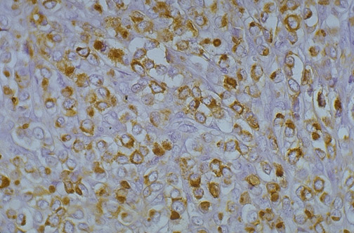 CA-125 is a marker for ovarian carcinomas, with cytoplasmic staining as seen in these neoplastic cells.