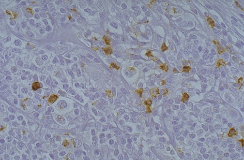 Scattered CD-15 positive cells appear in a non-Hodgkin's lymphoma. CD-15 also marks myeloid cells, but is best known as a marker for Reed-Sternberg and lacunar cells in Hodgkin's disease.
