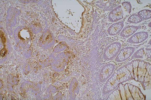 Carcinoembryonic antigen (CEA) positivity is marked in the neoplastic cells of the adenocarcinoma at the left, below the remaining normal colonic mucosa at the right, which has normal cells expressing little CEA.