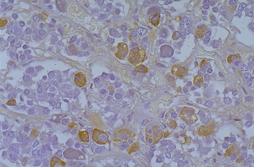 There are cells seen here in normal adenohypophysis that stain for human growth hormone.