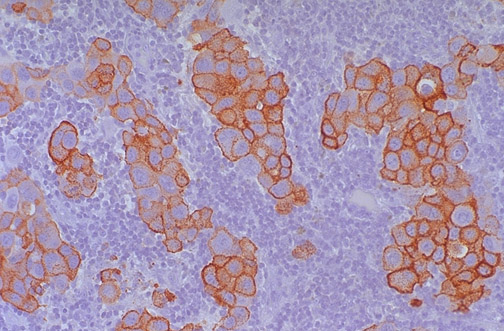 Metastatic melanoma is highlighted by staining with HMB-45 in this lymph node.