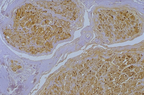The cross section of normal peripheral nerve is markedly positive for S-100, a protein marker for cells of neural origin.
