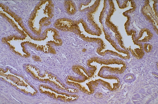 This section of normal prostate reveals marked prostatic acid phosphatase (PAP) activity in the glands.