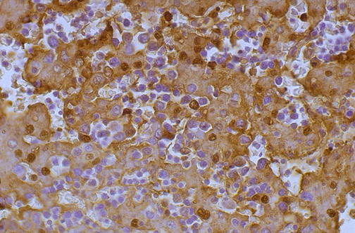 This section of normal fetal liver demonstrates staining of hepatocytes for alpha-fetoprotein.