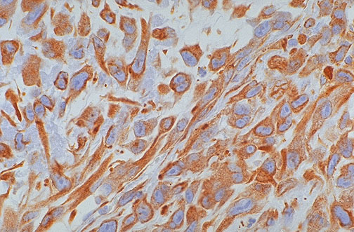 Positive staining in the cytoplasm of these neoplastic cells at high magnification with antibody to vimentin suggests that this is a sarcoma.