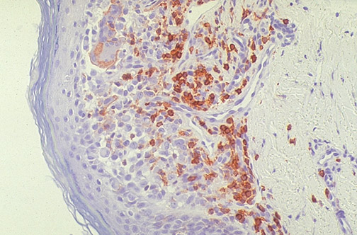 The mast cells within this lesion of urticaria pigmentosa in the dermis of the skin shown here stain positively with antibody to CD-68.