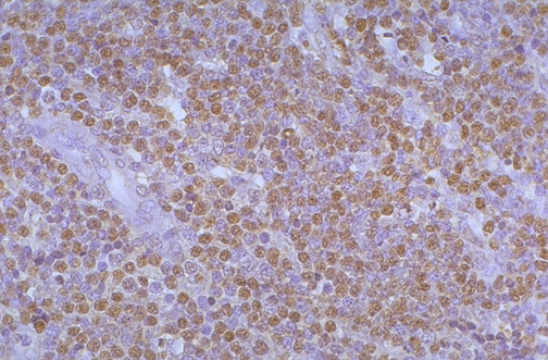Here is an example of immunoperoxidase staining with antibody to tDT (terminal deoxyribonucleotidyl transferase, a DNA polymerase). This is an enzyme that is a marker for acute lymphocytic leukemia.