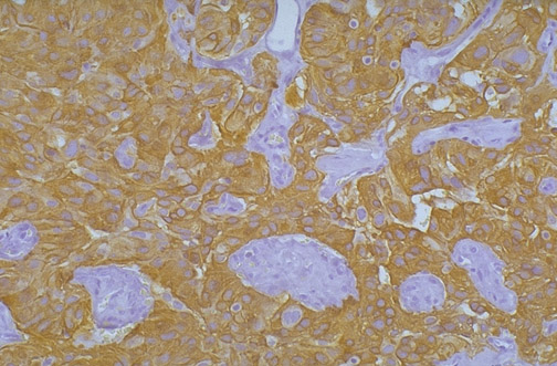This ependymoma has positive staining for glial fibrillary acidic protein (GFAP) indicating it is of central nervous system origin.