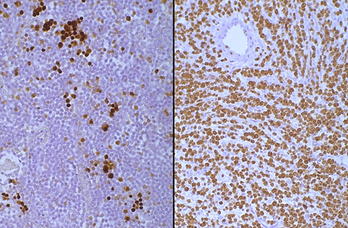 | In the left panel is a reactive lymphoid population with a few proliferation centers with clusters of MIB-1 positive lymphocytes, but less than 30% of the cells are staining. In the right panel, nearly the entire lymphoid population stains for MIB-1 in a malignant lymphoma. |