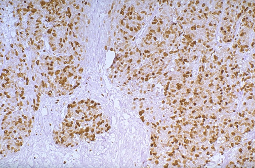 | Here is a MIB-1 immunoperoxidase stain in a breast carcinoma. Note the nuclear staining in the tumor cells. MIB-1 (Ki-67) is a marker for proliferation, indicative of an actively expanding cell population. The high degree of positivity in these tumor cell nuclei (over half are dark brown) is indicative of a high rate of tumor cell proliferation. In general, breast cancers with a low MIB-1 proliferation index have a better prognosis and are unlikely to have lymph node metastases. However, breast cancers with a high MIB-1 proliferation index have a worse prognosis. |