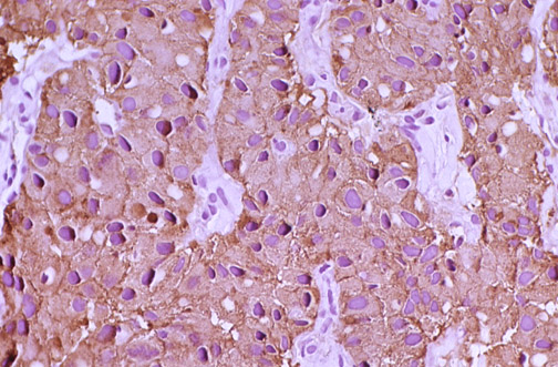 Neuron specific enolase (NSE) staining is demonstrated in the cytoplasm of these cells from a neuroendocrine carcinoma.