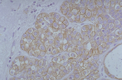 There is weak perimembranous staining for HER2-neu (C-erb B2), with a score of 2+, classified as positive, for this breast carcinoma.