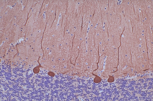 | This is the cerebellum, with the dark blue cells forming the granule cell layer below and the molecular layer above, with large Purkinje cells in between that are staining positively with antibody to calbinden with this immunohistochemical stain. Calbinden (a calcium binding protein) is found in neuronal cells. |