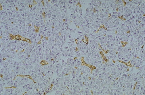 | This section of lymph node is seen with a stain for CD31, which has been shown to be a sensitive and specific marker for endothelial differentiation. There is a vascular proliferation seen here in this abnormal immune response. CD31 can help to identify vascular differentiation in neoplasms. |