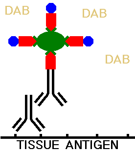 The tissue section is next washed to remove any excess ABC complexes. The the tissue on the slide is then incubated with a solution containing the reagent diaminobenzidine (DAB) which will react with the peroxidase and form the chromogen, making the areas of tissue with antibody binding visible under light microscopy.