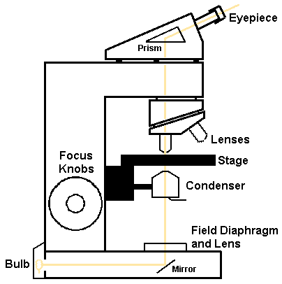 The microscope has a "condenser" lens below the stage which focuses the light source on the specimen being observed. Condensers are adjustable to move up and down, to center the light source, and to cut the amount of light with a movable diaphragm. In addition, many microscopes have an adjustable lens (the field diaphragm) just above the light source (below the condenser) which helps to focus the light in the plane of the condenser. By proper adjustment of these elements, "Koehler" illumination can be obtained in which there is even illumination across the field of view.