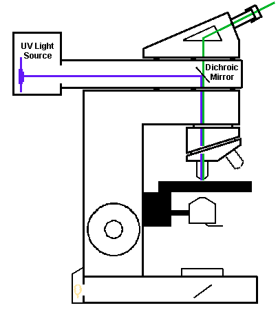 The microscope must be fitted with a source for fluorescent light. Modern fluorescent microscopes use "epifluorescence" in which the fluorescent light is aimed down on top of the specimen, which is then "excited" to give off visible light which then travels back up the same optical path and then to the eyepiece. Epifluorescence is possible because of a "dichroic" mirror. This mirror has the property of passing light at one wavelength while reflecting other wavelengths. It is thus possible to place the dichroic mirror into the path of the fluorescent light source so that the fluorescent light will be reflected down through the lens to the specimen on the glass slide on the microscope stage. The fluorescent light excites the dye or material on the slide, which then gives off light at a lower wavelength in the visible range. It is this reflected light that passes back up through the lens, passes through the dichroic mirror, and is viewed through the eyepiece. A "barrier" filter is also combined with the dichroic mirror to make sure unwanted wavelengths are not passed through it.