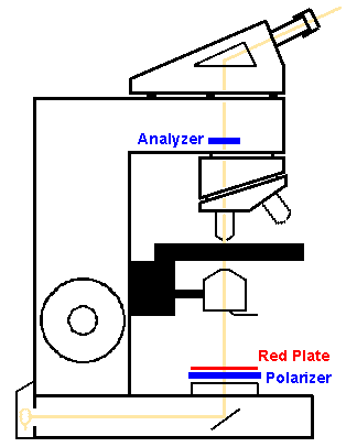 A red plate can be purchased (expensive) or you can make your own by applying two layers of clear adhesive tape to a glass slide. You will have to experiment with different tapes to get the right thickness, which you will know when your homemade "red plate" produces the reddest background. The long axis is the same as the long axis of the glass slide. Place the red plate on top of the polarizer over the light source and rotate it for the desired effect.