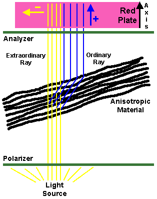Properties of positive and negative birefringence can be assessed only with an additional "compensator" plate placed on top of the polarizer (or in the condenser). This compensator is made of a material (quartz or selenite) which magically retards the light a quarter wavelength and produces an interference pattern with a red background on which the properties of positive and negative birefringence can be seen. Thus, the compensator is often called a "red plate". A material is said to be positively birefringent when it appears blue if its axis is aligned parallel to the long axis of the compensator, or "red plate". A negatively birefringent material will appear yellow under the same circumstances. The background will appear dark pink to red. In reality, birefringent materials will be oriented many directions on the slide, so you need to make note of the red plate's axis.