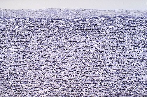 | This is a longitudinal section through the normal aorta with an elastic tissue stain at low power. The intima is at the top, while the thick aortic media demonstrates parallel dark elastic fibers, here highlighted by the elastic stain. The smooth muscle fibers are between the elastic fibers. |
