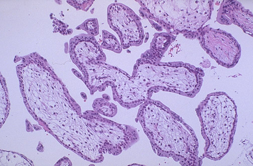 | In the first trimester, the chorionic villi of the placenta are large and covered by two layers of cells--the darker inner cytotrophoblast and the outer syncytiotrophoblast with abundant pink cytoplasm. The blood vessels within each villus are not prominent at this time. Maternal blood circulates between the villi |