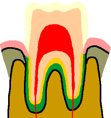 | This is the normal appearance of a tooth. The part seen above the stratified squamous epithelium of the gingiva is the "clinical crown" while the "anatomic crown includes the part covered by enamel. Beneath the enamel is a layer of dentin. The center of the tooth is filled with pulp that contains nerves and vessels, extending down as the root canal. and exiting at the apical foramen. The root of the tooth, covered by cementum, is embedded in bone and anchored by the periodontal ligament. Dense connective tissue lies beneath the soft gingival epithelium. |