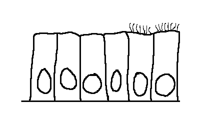 Pseudostratified columnar epithelium: not all the cells along the basal lamina reach the lumenal surface, though all contact the basal lamina. This type of epithelium lines the respiratory tract from the nasopharynx down into the bronchioles of the lung. Cilia are present.