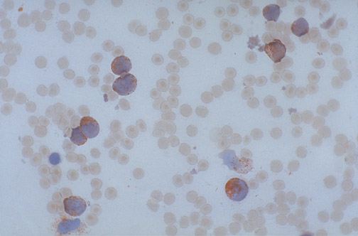 This peripheral blood smear is stained with the myeloperoxidase stain, and there is red reaction product in these leukemic cells, indicative that this is a myeloid leukemia.