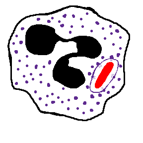 | Success! You have captured the bacterium. Following engulfment, the bacterium is contained within a phagosome, and lysosomal granules fuse with it, releasing their contents to form the phagolysosome seen here. Rapid activation of NADPH oxidase leads to generation of superoxide that is converted to hydrogen peroxide by spontaneous dismutation. Along with myeloperoxidase from the neutrophil azurophilic granules and halide ion, hydrogen peroxide is converted to HOCL that destroys the bacterium by halogenation. |