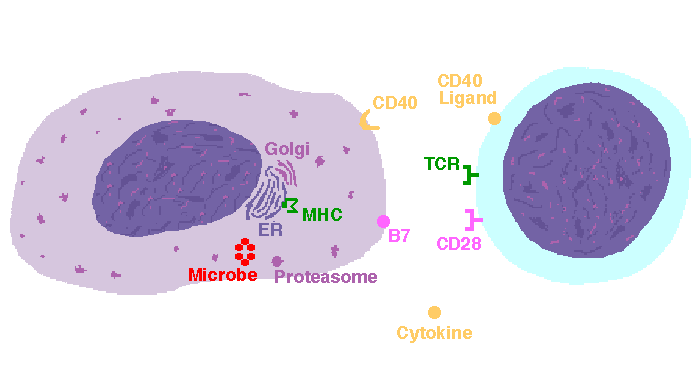 The interaction of a macrophage (an antigen presenting cell) on the left with a CD8 cell on the right is shown above. The key components of this interaction are labelled below. The intracellular microbe living within the macrophage produces antigenic protein that is unfolded, ubiquinated, and digested in a proteasome into antigenic peptides. The MHC I molecule is manufactured in the endoplasmic reticulum (ER), has a beta-2 microglobulin molecule added, and is packaged in the Golgi apparatus. The antigenic peptide fills the binding site of the MHC when fusion with the phagosome carrying microbial peptide fragements occurs. The MHC molecule is transported and displayed on the macrophage surface. The CD8 lymphocyte then interacts with the macrophage, using its T cell receptor (TCR) to recognize the MHC displaying a peptide specific for that TCR. The TCR complex on the CD8 cell consists of variable alpha and beta chains of TCR that recognize the antigen, along with a gamma chain and a CD3 protein that signal the cell when contact with a specific MHC carrying antigen occurs. Adhesion and signal transduction are further aided by a protein specific to the T cell surface (CD8 in this case). Adhesion is also mediated by integrins expressed by the CD8 cell that contact macrophage ligand. This recognition is aided by a costimulator (B7) on the macrophage surface that interacts with CD28 on the T cell surface. This "turns on" the CD8 cell which then uses a CD40 ligand to stimulate the macrophage to increase cytokine production that further activates the CD8 cell to become a cytotoxic cell and to enhance CD8 cytokine production. This mechanism helps to keep immune responses highly specific for a microbe and produce specific antibody against the microbe. This interaction can increase the T cell response. |