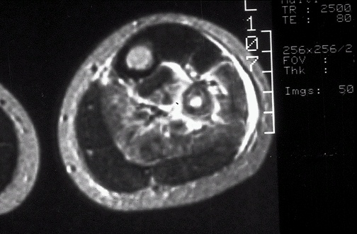 Image 2.2 In this MRI scan in axial (transverse) view through the mid-calf, there is irregular bright extension of the lesion into soft tissue from the bone of the fibula. The normal bone cortex is dark, while normal marrow containing fat is brighter. |
