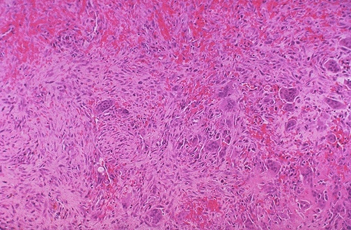 The blood interdigitates with numerous multinucleated giant cells in a fibroblastic stroma.