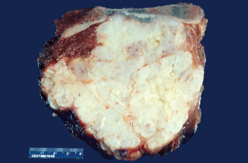The tissue from the mass is very irregular on sectioning, with bluish-white color and firm consistency.