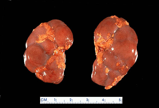 The normal gross appearance of fetal kidney is seen here. Note fetal lobulations.