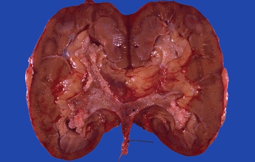 The kidney has been bivalved to show the collecting system. A soft pink papillary mass is attached to the urothelium and fills part of the collecting system.