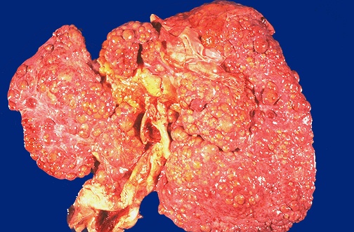 | Ongoing liver damage with liver cell necrosis followed by fibrosis and hepatocyte regeneration results in cirrhosis. This produces a nodular, firm liver. The nodules seen here are larger than 3 mm and, hence, this is an example of "macronodular" cirrhosis. |