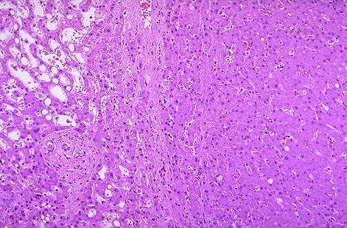 | Normal liver tissue with a portal tract is seen on the left. The hepatic adenoma is on the right and is composed of cells that closely resemble normal hepatocytes, but the neoplastic liver tissue is composed of disorganized hepatocyte cords and does not have a normal lobular architecture. |