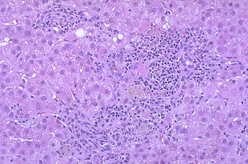 | This is a case of primary biliary cirrhosis, a rare autoimmune disease (mostly of middle-aged women) that is characterized by destruction of bile ductules within the triads of the liver. Seen here at medium power are intense mononuclear inflammatory infiltrates in portal tracts with loss of bile ductules. The inflammatory infiltrate can have granulomatous features as well. |