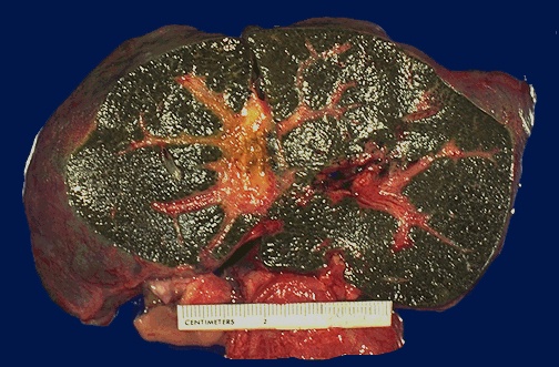 | This 3 month old child died with extrahepatic biliary atresia, a disease in which there is inflammation with stricture of hepatic or common bile ducts. This leads to marked cholestasis with intrahepatic bile duct proliferation, fibrosis, and cirrhosis. This liver was rock hard. The dark green color comes from formalin acting on bile pigments in the liver from marked cholestasis, turning bilrubin to biliverdin. |