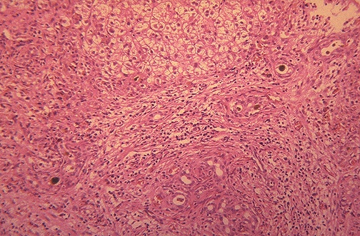 | Microscopically, extrahepatic biliary atresia leads to this appearance in the liver, with numerous brown-green bile plugs, bile duct proliferation (seen at lower center), and extensive fibrosis. If a large enough bile duct can be found to anastomose and provide bile drainage, then surgery can be curative. |
