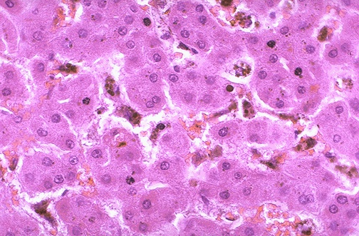 | The Kupffer cells in sinusoids next to plates of hepatocytes are seen prominently here because of the brown granules of hemosiderin that they contain. Kupffer cells are a part of the body's mononuclear phagocyte system of cells with a macrophage-like function which are fixed in organs such as liver, spleen, lymph nodes, and bone marrow. |