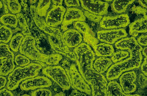 | This immunofluorescence pattern demonstrates positivity for anti-mitochondrial antibody (AMA) which has an association with primary biliary cirrhosis. The tissue substrate for this test is renal parenchyma, and the tubular cells have lots of mitochondria, which fluoresce bright green. |