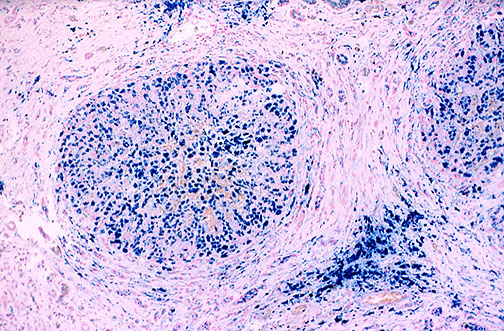 | The Prussian blue iron stain reveals extensive hepatic hemosiderin deposition microscopically in this case of hereditary hemochromatosis (HH). Note that there is also cirrhosis. Excessive iron deposition in persons with HH can affect many organs, but heart (congestive failure), pancreas (diabetes mellitus), liver (cirrhosis and hepatic failure), and joints (arthritis) are the most severely affected. |