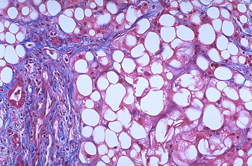 | The term non-alcoholic fatty liver (NAFL) has been applied to the appearance of fatty liver in patients without a history of alcoholism. NAFL can be seen with diabetes mellitus. NAFL can be reversible, but in some cases it proceeds to fibrosis, called steatohepatitis (NASH), and even cirrhosis. There is variable inflammation. This trichrome stain demonstrates blue-staining collagen extending from the centrilobular region at the right. |
