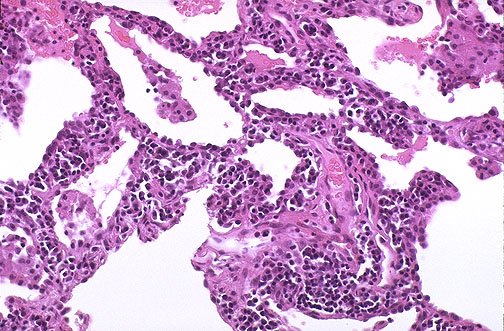| This is an example of lymphocytic interstitial pneumonitis (LIP) in which small lymphocytes fill the interstitium and perivascular regions of the lung. This disease appears uncommonly in adults with autoimmune diseases. It is uncommon in children except in the setting of AIDS. |