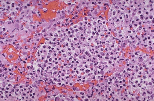 | At high magnification, the alveolar exudate, mainly neutrophils, is seen here. The surrounding alveolar walls have capillaries that are dilated and filled with RBC's. Such an exudative process is typical for bacterial infection involving the lungs. This exudate gives rise to the productive cough of purulent yellow sputum seen with bacterial pneumonias. |
