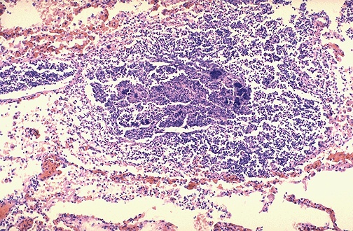 | This more focal abscess containing a neutrophilic exudate as well as dark blue bacterial colonies suggests aspiration or hematogenous spread of infection to the lung. Aspirated material from the oral-pharyngeal region contains bacterial flora. Hematogenous spread of infection to lungs could occur from septicemia or from infective endocarditis involving the cardiac valves on the right side of the heart. |