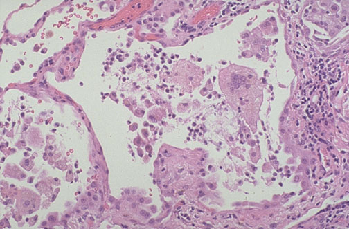 | This is the microscopic appearance of an exogenous lipid pneumonia in which lipid vacuoles appear, mainly along airways, accompanied by an inflammatory response that can contain foreign body giant cells. The term exogenous refers to the origin of the lipid material outside the body. The oily material is aspirated into the bronchial tree. |